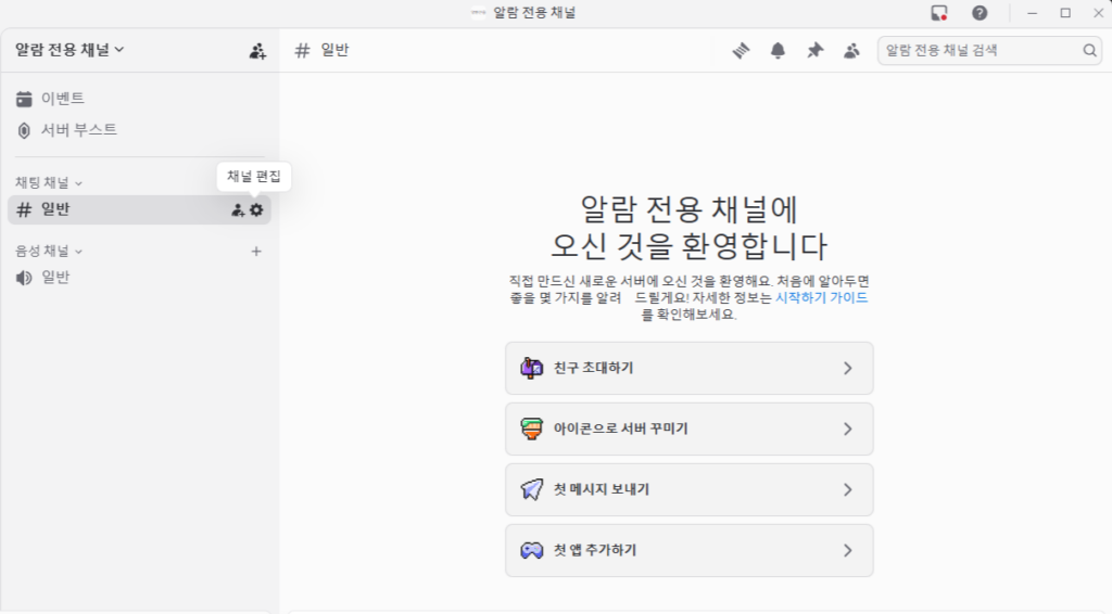 먼저 서버 알람 전용으로 사용할 텍스트 채널을 하나 생성하거나, 기존 채널을 선택합니다. 일반 대화방과 섞이지 않도록 ‘알람 전용 채널(예: #server-alert)’을 분리하여 만드는 것을 강력히 권장합니다.