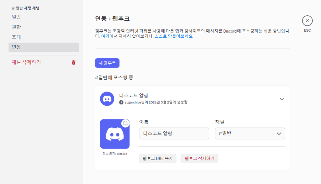• 프로필 이미지: (선택 사항) 서버 아이콘이나 경고(🚨) 이미지 등을 등록해 두면 모바일에서 알람을 볼 때 가독성이 훨씬 좋아집니다.