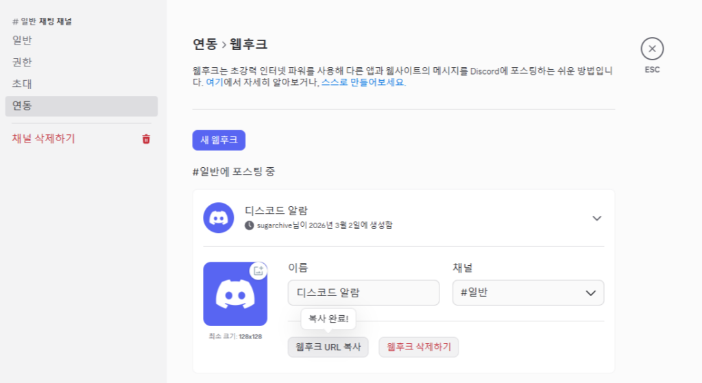 2. 복사된 긴 URL(예: https://discord.com/api/webhooks/12345...)을 메모장 등 안전한 곳에 임시로 붙여넣어 둡니다. [ 복사가 된다면 다음과 같이 복사 완료 텍스트가 팝업 됩니다. ]