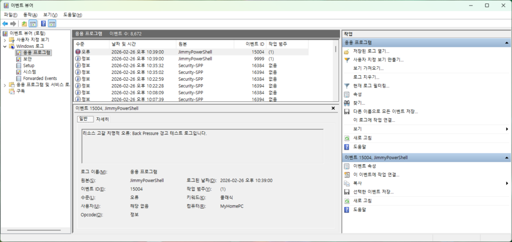 만약 모니터링 시스템이 15004번 알람을 제대로 수신하는지 테스트하고 싶은데, 1부에서 다룬 eventcreate를 쓰면 오류가 발생하며 튕겨냅니다. 하지만 PowerShell은 .NET Framework와 Windows API에 직접 접근하므로 이러한 제한 없이 원하는 모든 로그를 정교하게 찔러 넣을 수 있습니다.