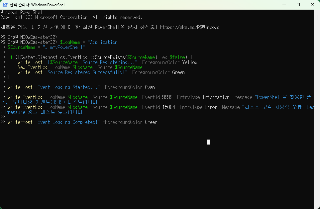 Write-EventLog -LogName $LogName -Source $SourceName -EventId 9999 -EntryType Information -Message "PowerShell을 활용한 커스텀 모니터링 이벤트(9999) 테스트입니다."